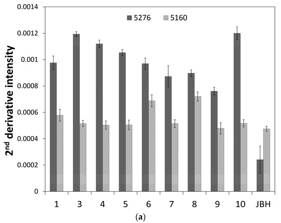Figure 3 depicts a PC1 and PC2 score plot of the PCA that was built using the NIR spectra of egg yolk obtained in the period from the first day after fertilization to the day JBH. Of note in Figure 3 is that the data obtained on the day JBH are clearly separated from other data in PC1. Figure 4 shows a loadings plot of PC1 of the PCA shown in Figure 3, with peaks at 5276 and 5160 cm−1 assigned to weakly hydrogen-bonded and strongly hydrogen-bonded water, respectively [36,37]. It is highly possible that the conditions of hydrogen bonding of water change significantly JBH. Figure 5 depicts variations in the 5500–4500 cm−1 region of the second derivative spectra of egg yolk measured in the period from the first day after fertilization to the day JBH. The intensity ratio of the two bands at 5276 and 5160 cm−1 caused by weakly hydrogen-bonded and strongly hydrogen-bonded water, respectively, were significantly different on the day JBH. The second derivative intensity with the sign inverse at 5276 and 5160 cm−1 can be seen in Figure 6a and the intensity ratio of 5160/5276 cm−1 versus day is shown in Figure 6b. The band intensity at 5160 cm−1 remained the same, but at 5276 cm−1 the band intensity diminished, with the intensity ratio increasing on the day JBH. Therefore, it is highly possible that the percentage of the weakly hydrogen-bonded water decreases markedly on the day JBH. In our previous study, we found that the ratio of the characteristic peaks owing to proteins and lipids in the second derivative spectra suggested that the relative concentration of proteins to lipids was constant in the egg yolk. However, the ratio of chemical components such as proteins and lipids to water increased in the present study, as shown in Figure 2c–f. Hence, water might interact strongly with the surrounding materials resulting in the weakly hydrogen-bonded water decreasing. The components variations and interaction changes between molecules toward hatching are assumed to be reflected in the water hydrogen bonding structure.