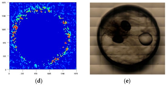 Figure 10 compares the NIR images developed by the intensities of the second derivative spectra at (a) 5756; (b) 4864; (c) 4616; and (d) 4530 cm−1 caused by proteins in a medaka egg on the fifth day after fertilization. According to the literature, these bands are assigned to (a) α-helix; (b) combination of the NH stretching mode; (c) amide II; and (d) β-sheet structure, although there is still room for further research to assign the bands for the membrane structure and protein secondary structures [38,39]. From Figure 10b,c it can be seen that the egg yolk contains higher concentrations of proteins than do the other parts. It is assumed that 5756 and 4530 cm−1 are characteristic peaks from proteins that consist of membranes as shown in Figure 10a,d. Previous studies have indicated that proteins forming membranes have an almost α-helix and β-barrel secondary structure [40,41]. The fact that the membrane structure of the egg is successfully visualized by NIR imaging, as shown in the present study, is an important result.