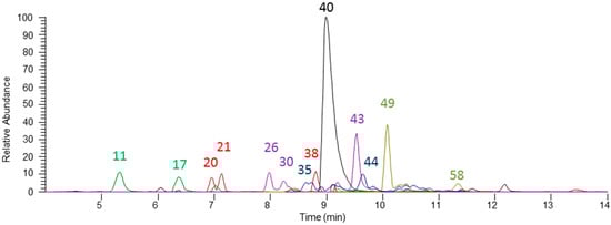 Methanol, acetonitrile, formic acid, toluene, and C8–C20 alcane solution were purchased from Sigma-Aldrich (Milan, Italy). Ultrapure water from MilliQ system (Millipore, Bedford, MA, USA) was used throughout the experiment. The proprietary spearmint extract was manufactured by Kemin Foods, L.C. (Des Moines, IA, USA) as described [11,49]. In brief, the spearmint extract was prepared by microwave drying within one hour of harvest followed by extraction of the dried spearmint leaf with acidified water.