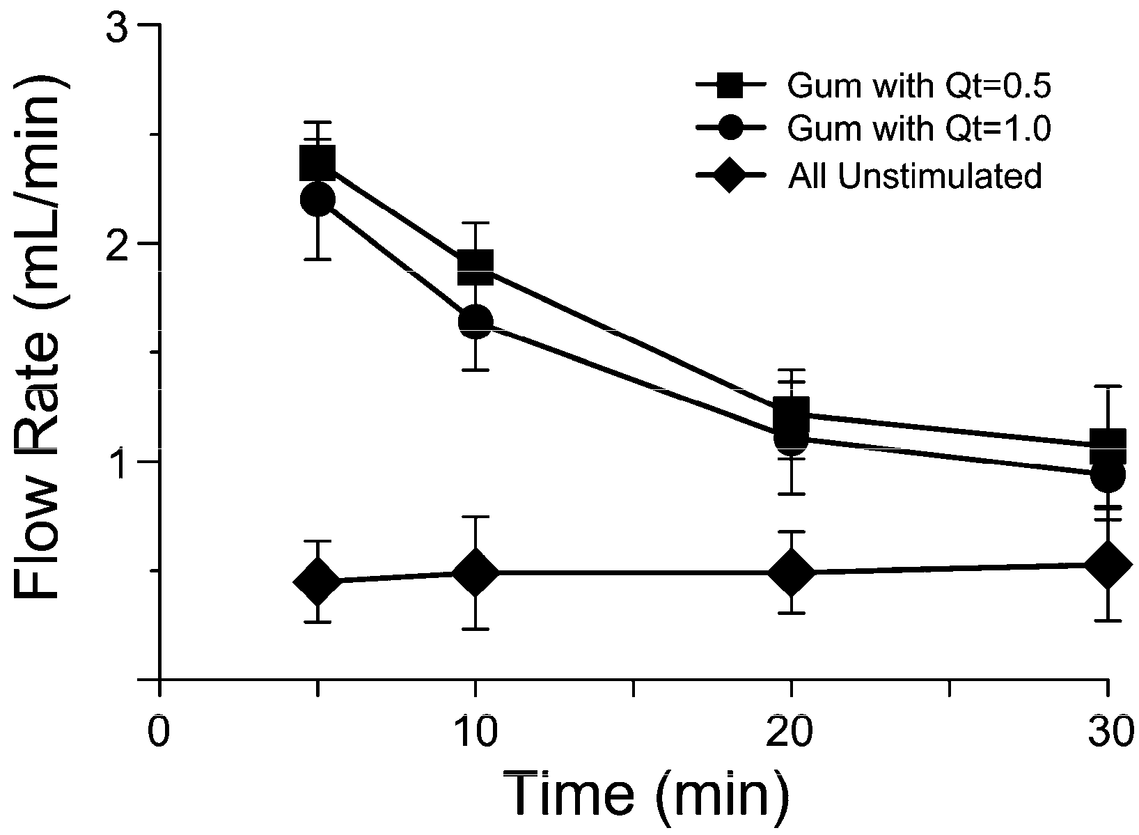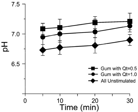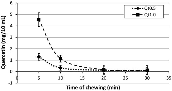 - Experimental (Group A): An experimental chewing gum containing 10 mg of quercetin was used. This concentration of Qt was preferred for its highest release in oral saliva during the first minutes of chewing in the first in vivo trial.