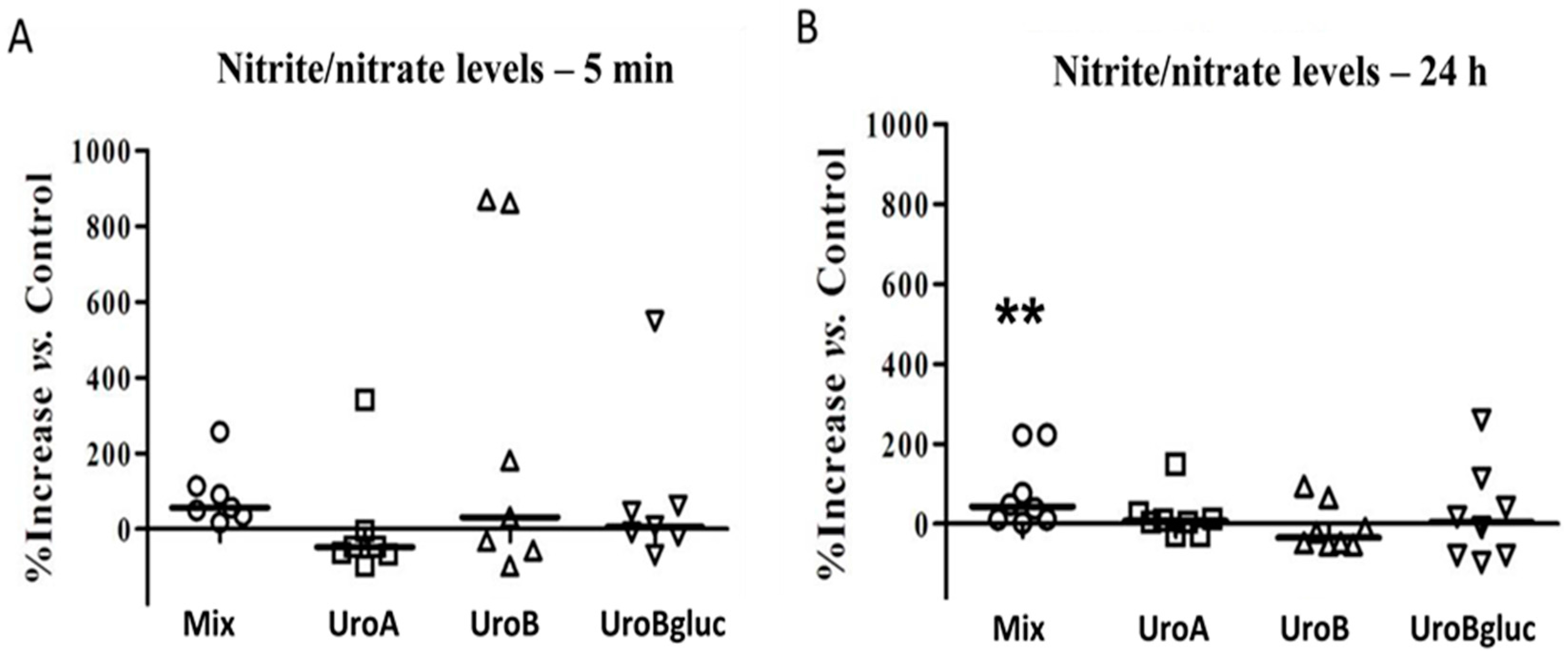 Variation in nitrite/nitrate levels in the supernatant of HAECs cultured at 5 min (A) and 24 h (B) with respect to control condition (0.1% DMSO). Mix: urolithin mix at 5 μM each; uro A: urolithin A; uro B: urolithin B; Uro Bgluc: urolithin B-glucuronide. n = 7; ** significant at p < 0.01 vs. control. Each experimental condition is represented by a specific symbol (Mix: circles, Uro A: squares, Uro B: triangles, Uro Bgluc: inverted triangles) and bars represent the median values.
