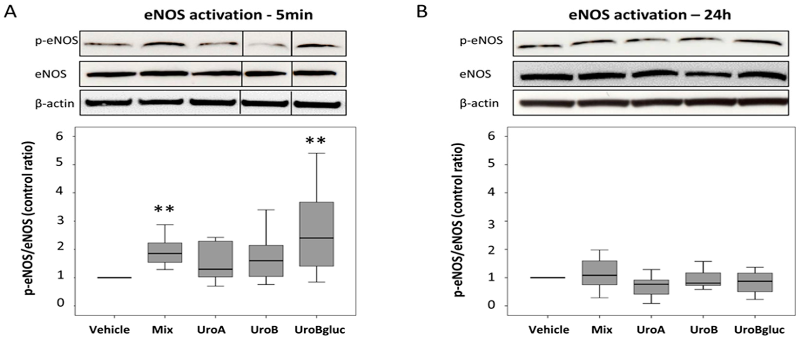 In order to clarify the role of eNOS in the observed NO secretion, eNOS activation at the same time points (5 min and 24 h) was assessed. Exposure to mixed urolithins increased eNOS activation at 5 min (1.8-fold increase vs. control) but not at 24 h (Figure 2), justifying the increase in NO levels at the later time point (24 h). Uro A and Uro B at 15 μM did not exert any statistically significant effect on eNOS expression either at 5 min or at 24 h. In contrast, a significant 2.4-fold increase in eNOS activation compared to the control was observed when HAECs were incubated in the presence of Uro Bgluc 15 μM for 5 min.