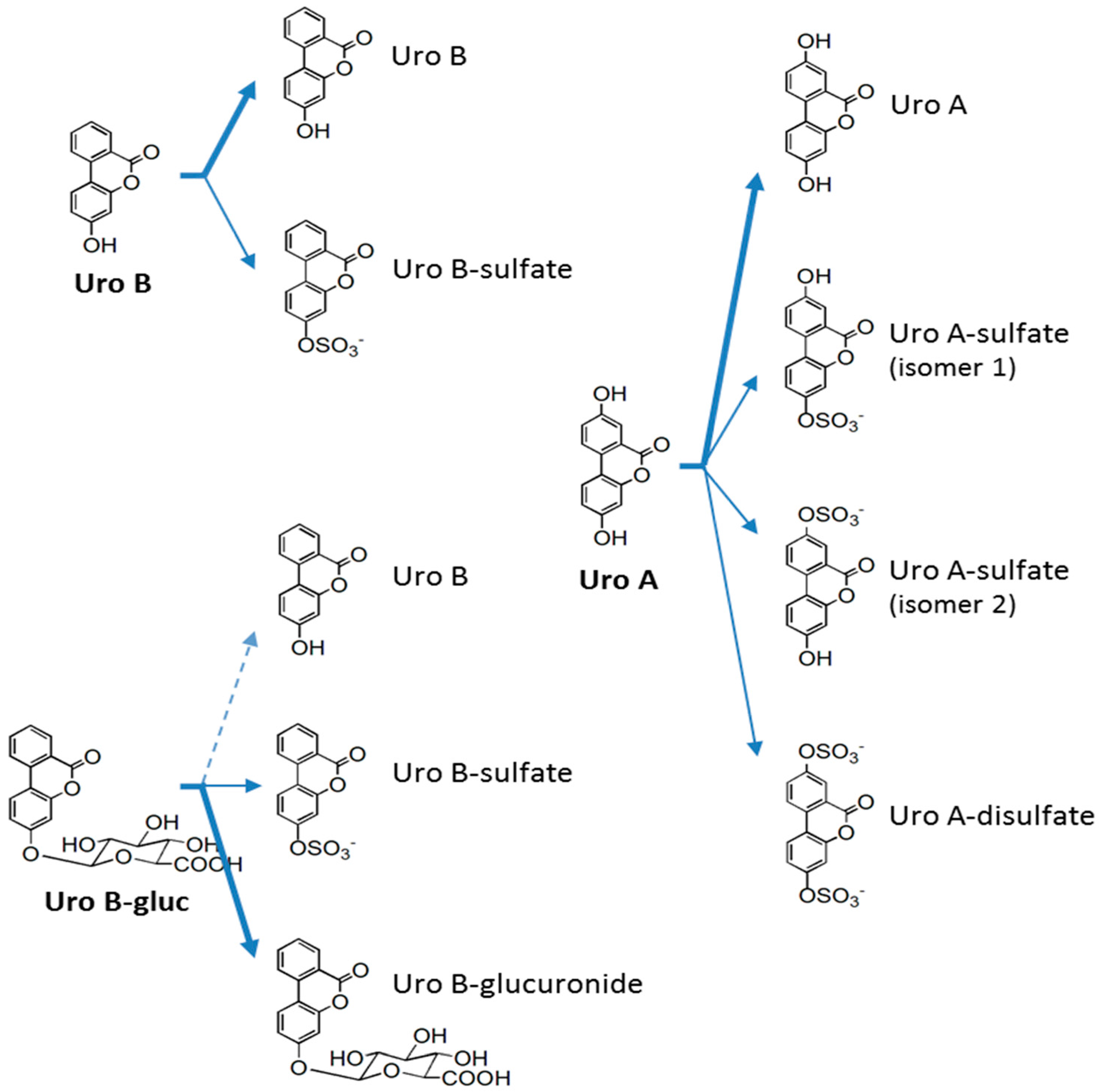 Metabolic biotransformations occurring in human aortic endothelial cells and compounds present contemporaneously in the cell media at 24 h. Bold arrows indicate major pathways, which correspond to incubated urolithins; normal arrows, newly-formed metabolites; and dotted arrows, spontaneous deglucuronidation due to cell media conditions.