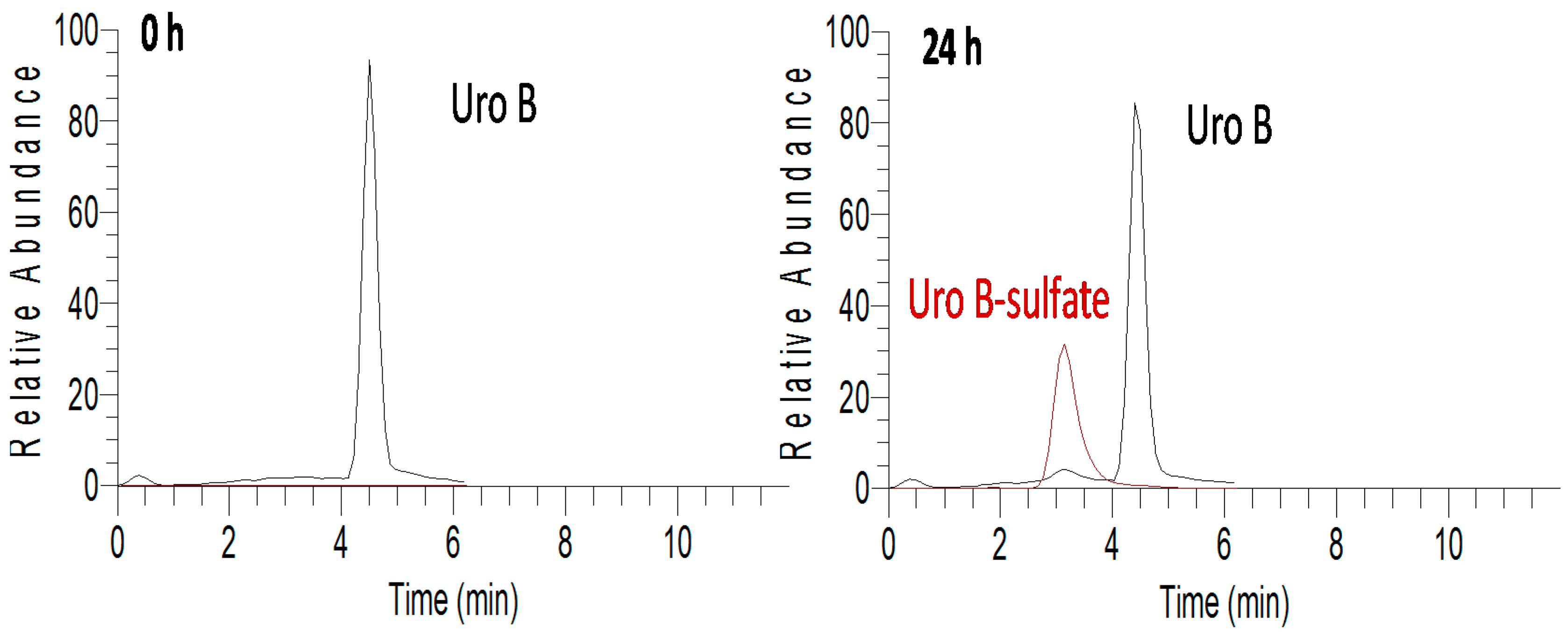 Chromatograms of compounds present in cell media at 0 and after 24 h of incubation with Uro B, extracted in selected ion-monitoring mode. Areas of the metabolites should not be considered as quantitative indicators since ionization efficiencies of the individual compounds may be different.