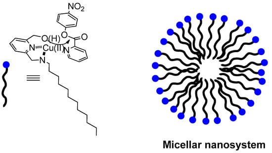 Aggregates of amphiphilic molecules endowed with the ability to complex metal ions have been dubbed metallomicelles []. Micelles are spherical nanosystems roughly 3 nm in size. In an aqueous solution they expose the hydrophilic headgroups to the bulk water while the hydrophobic portion of each molecule is mostly buried in the interior. This is, however, an over approximation as it is well accepted that water molecules manage to permeate in the interior so that the “hydrophobic” environment is not much different from that of an alcoholic solution. In metallomicelles the polar headgroup is constituted by a metal complex. An early example was reported by Moroi et al. [] who prepared poorly soluble Cu(II) alkylsulfonates. More or less at the same time, a bunch of laboratories started studying aggregates of metalloamphiphiles. Thus, Gutsche and Mei [] found that the copper complex of a tetradentate ligand bearing a hydrocarbon chain catalyzed the hydrolysis of acetyl phosphate by a factor of ten. Catalytically active copper bolaforms were reported by Tonellato et al. [] Several groups, including those of Tagaki [] and Breslow [] examined micelles containing heavy metals other than copper. In 1987 Menger [], in response to the pressing quest for destroying nerve agents, i.e., phosphate-based chemical weapons, reported a striking example of an amphiphilic Cu(II)-complex very effective in the cleavage of phosphate triesters including some of these noxious chemicals. We argued that a built-in nucleophile would perform better than one recruited from the solvent. For this reason we prepared hydroxy-functionalized lipophilic pyridine-based ligands turning into surfactants upon metal ion complexation, and hence able to form micelles in aqueous solution []. The aggregates were particularly active catalysts in the cleavage of α-amino acid esters, i.e., substrates able to interact with the metal ion via coordination of the amino group. Most of the studies have been done with unnatural p-nitrophenyl picolinate (PNPP, Figure 1).