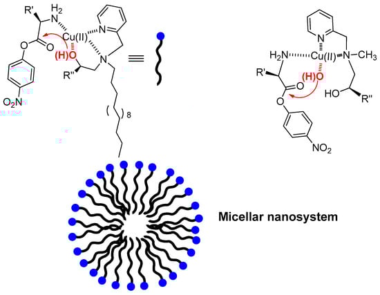 One of such examples was reported by us on studying the system depicted in Figure 3 [,]. It is not much different from those reported above but for the presence of a chiral center at the carbon holding the built-in nucleophile. Indeed, our idea was that of using it for the enantioselective hydrolysis of chiral amino acid esters. The Cu(II) complex of the most lipophilic ligand forms micelles that showed remarkable rate acceleration and enantioselectivity (kS/kR ca. 10) in the cleavage of the p-nitrophenyl ester of phenylalanine (PhePNP). Strikingly, however, control experiments with a Cu(II) complex unable to form aggregates, not only showed very poor enantioselectivity but turned out to be an inhibitor of the cleavage process. We showed that the enantioselectivity with the micelle-forming ligand was strictly related to the formation of a ternary complex (ligand/Cu(II)/ester) as indicated by the almost complete absence of selectivity (kR/kS = 1.5) when Z-protected phenylalanine (Z-PhePNP) was used as substrate. This and other experiments led to the conclusion that the observed behavior was correlated to the environment-controlled shift of the equilibrium of coordination of the ligand alcoholic arm to the metal center. In the case of the non-micellized complex water competition prevented the ligand hydroxyl from the coordination to the metal. The reactivity was hence decreased as the built-in nucleophile was no longer available and the ligand chirality had poor effect on the reaction. By the contrary, when the ligand hydroxyl was bound to the metal ion in the less polar micellar environment the system was able to take advantage of the pseudo-intramolecular attack to the coordinated ester. This modulation of the coordination sphere of the metal ion in aggregates appears to be a general phenomenon and has been observed also with other lipophilic metal complexes []. This fine tuning of the coordination sphere of the metal ion highlights how much sensitive it is even to very small changes of the polarity of the environment. Noteworthy, the modification of the medium at the reaction site affects reactivity also on the surface of monolayer-protected gold nanoparticles, although, in these cases it occurs in systems devoid of the metal ion as a catalytic unit [,].