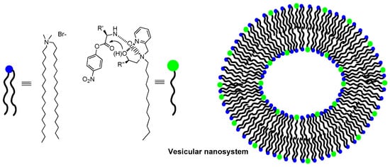 A case in which being a micelle or a vesicle does make the difference is enantioselective hydrolysis. In view of the higher degree of organization of vesicles respect to micelles mentioned above one could expect better results in term of enantioselectivity. When the lipophilic catalyst reported in Figure 3, discussed in the previous section, was embedded in a vesicular bilayer a three-fold increase in enantioselectivity was observed [].
