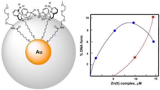 HPNPP, as a model of RNA, has the advantage of containing an hydroxyl group that, acting as intramolecular nucleophile, greatly increases the cleavage rate of the phosphate bond. This is why RNA is cleaved much faster than DNA, too. In fact, a phosphate diester devoid of such an intramolecular nucleophile requires, for its cleavage, a more efficient catalyst. With this in mind, we functionalized the monolayer of AuNPs with a ligand in which the action of the metal ion could be assisted by ancillary groups providing extra contribution to the catalysis. We prepared a bis-(2-amino-pyridinyl-6-methyl)amine (BAPA) functionalized thiol (Figure 7), as the BAPA-Zn(II) complex is known to be able to elicit the cooperation between metal Lewis acid activation and hydrogen-bonding to achieve increased hydrolytic activity toward phosphate diesters [,,,,,,,]. The nanoparticles were prepared following a two-step protocol [] relying on the preliminary passivation of the gold surface with a secondary amine followed by the final introduction of the functionalized thiol. The resulting Zn(II) nanoparticles proved to be one of the most effective catalysts reported so far for the cleavage of the DNA model phosphate, bis-p-nitrophenyl phosphate (BNPP) []. The second-order rate constant observed was not only 100-fold better than that of the monomeric complex but more than 60,000 higher than that of the OH–catalyzed background reaction. The dependence of the rate constants on the equivalents of Zn(II) added showed the occurrence of two catalytically relevant situations. At low Zn(II) loading, a mononuclear complex was the active species while at Zn(II) saturation, a dinuclear complex was the catalyst. This represents a significant difference from the previous examples with HPNPP, where only the dinuclear catalysts were significantly effective. When we challenged our AuNPs in the cleavage of plasmid DNA we were rewarded by very interesting results. The hydrolytic process with this substrate can be conveniently followed by gel electrophoresis. The conversion of the compact supercoiled conformation of the polymer (form I) to the relaxed circular one (form II) following a single cut in one of the two strands is associated with a remarkable change in mobility. If the following cut occurs in the other strand in close proximity (less than 12 nucleotides far) to the first one, a further change occurs with the linearization of the double strand (form III), also easily detectable in the gel. Statistically only one cut over 100 occurs in the proper position to lead to linearization. Consequently, linear form starts to appear in significant amount only after most of the supercoiled has been cleaved. Strikingly, in the presence of the nanoparticles linear DNA started forming after only 10% of the original supercoiled DNA was cleaved and at 16% cleavage it became the most abundant form present (Figure 7, right). This clearly indicated that the nanoparticle was able to perform multiple simultaneous cuts on the double strand taking advantage of multivalency on two counts: first by creating the dinuclear catalytic site and second by providing on the same AuNP multiple catalytic (dinuclear) sites. This latter property led to the efficient linearization of the supercoiled DNA, a behavior common in enzymes but never observed with other artificial catalysts.