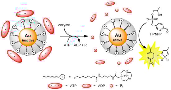 Not surprisingly, cationic nanoparticles show a very high affinity for oligoanions. This includes anionic oligopeptides, ATP, ADP, oligophosphates, and anionic proteins []. In line with what is expected for electrostatically-driven interactions, a systematic study of a series of phosphates and carboxylates revealed that the affinity of the oligoanions for the catalytic monolayer surface was strictly related to the number of negative charges of the probe. The strength of the interaction was dictated by the nature of the cationic group on the surface of the AuNP: ammonium groups proved less efficient than cationic metal complexes. This property was used for the detection of enzyme activity taking advantage of the catalytic properties of the monolayer of metallonanoparticles []. The enzyme assay (Figure 8) relied on the use of an anionic peptide acting both as the enzyme substrate and as a species strongly binding to the surface of the cationic AuNPs. The set up took advantage of the fact that the enzyme substrate and HPNPP (both anionic) were competing for the surface of the nanoparticle. With the polyanionic peptide showing an higher affinity for the Zn(II) AuNP, HPNPP was prevented from interacting with the nanoparticle and hence was not cleaved by the nanosystem. However, upon hydrolysis by the enzyme, the peptide (acting as an inhibitor) was fragmented loosing affinity for the monolayer surface. As a consequence, catalytic activity against HPNPP of the monolayer was restored, resulting in the production of the p-nitrophenolate anion as a reporter molecule of the activity of the enzyme. An attractive feature of the system was the catalytic signal amplification [] so that the amount of produced signal was connected to the turn-over number of the catalyst.