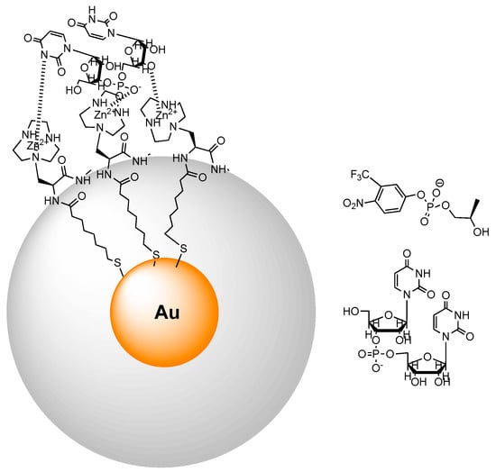 - Bonomi, R.; Scrimin, P.; Mancin, F. Phosphate diesters cleavage mediated by Ce(IV) complexes self-assembled on gold nanoparticles. Org. Biomol. Chem. 2010, 8, 2622–2626. [Google Scholar] [CrossRef] [PubMed]