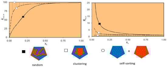 Calculated kinetic (kcat, left panel) and binding (Km, right panel) profiles for the cleavage of HPNPP by AuNPs with a mixed monolayer comprising a catalytic triazacyclononane-Zn(II) thiol and an inactive one (featuring a oligoether functional group) as a function of the mole fraction. The curves simulate the situation with thiols distribution ranging from random (filled squares), cluster formation (empty squares) and total sorting (empty circles). They assume that once all available Zn(II) complexes are able to form a dinuclear catalytic site the reaction rate doesn’t increase any further. The tiles representation on the bottom gives an idea of the thiols arrangement on the surface for the three different situations (blue and red are the inactive and active thiols, respectively). The experimental data fit nicely the unsorted thiols arrangement and confirm the reaction rate doesn’t increase once the dinuclear catalytic sites are formed (ca. 0.4 mole fraction, left panel). The dissociation constant, however, decreases smoothly till 100% reactive thiol covers the AuNP surface (right panel).
