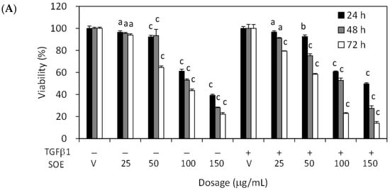 Effects of concentration and duration of SOE treatment on proliferation of endometrial cancer cells, with or without TGFβ1 (2.5 ng/mL) stimulation. (A) HEC-1A cells and (B) RL95-2 cells. Cancer cells were cultured in 96-well plates at a density of 1 × 104 cells/well. Cells were treated with 0–150 μg/mL SOE for 24–72 h. Cell viability was measured using 3-(4,5-dimethylthiazol-2-yl)-2,5-diphenyltetrazolium bromide (MTT) assay. Three independent experiments were conducted; results are expressed as mean ± SD. A significant difference from the respective vehicle, according to Student’s t-test, was indicated as “a” for p < 0.05; “b” for p < 0.01, and “c” for p < 0.001.
