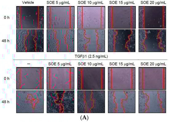 Cancer cells were seeded at 1 × 106 cells/mL in 200 μL DMEM with a Culture Insert-2 Well (ibidi GmbH, Munich, Germany) and were cultivated for 24 h. After the culture insert was removed, DMEM with specified SOE concentration was added, with or without TGFβ1 (2.5 ng/mL) stimulation, and the cells were then incubated. Images of unfilled areas under each condition were obtained using an inverted phase-contrast microscope (Nikon Eclipse TS100, Chiyoda-ku, Tokyo, Japan) at a magnification of 20×. All wound healing assays were conducted in triplicate. The closure rate was calculated using the following formula: