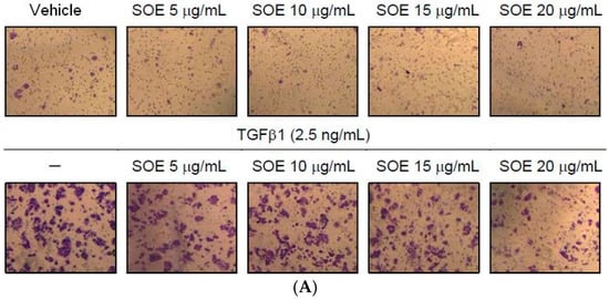 Cell migration and invasion were assessed using the CytoSelect™ 24-well cell migration assay (Cell Biolabs, San Diego, CA, USA) and BioCoat™ Matrigel™ Invasion Chamber (BD Biosciences), respectively. To determine the effect of SOE on cell migration, 1 × 106 cells/mL were seeded in serum-free DMEM on a polycarbonate membrane insert (8 μm pore size). The cells were then treated with various concentrations of SOE, with or without the stimulation by TGFβ1 (2.5 ng/mL). The bottom chamber was filled with DMEM that contained 10% FBS as a chemo-attractant. The chamber was incubated for 48 h at 37 °C. Next, non-migrating cells in the upper chamber were wiped away using a cotton-tipped swab, and invading cells were fixed with methanol, stained with 0.2% crystal violet, and photographed under a phase-contrast microscope. The same procedure was also carried out in experiments on cell invasion, except that the polycarbonate membrane was coated with a uniform layer of collagen. The migration index and the invasion index were estimated using the following equation: