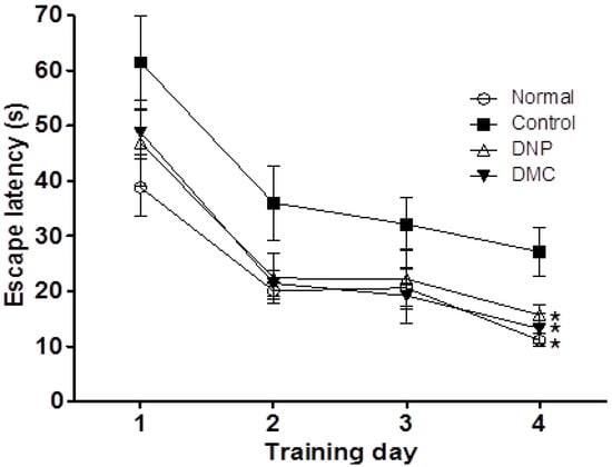 Effect of DMC on hidden-platform acquisition training in Morris water maze. DMC (10 mg/kg, p.o.) and DNP (2 mg/kg, p.o.) were administered once a day for 28 days. Memory impairment was induced by scopolamine (1 mg/kg, i.p.). Comparison of escape latency between DMC-treated groups (n = 8 per group) and scopolamine-treated control group during four training days. Data are presented as mean ± SEMs (n = 8 per group). * p < 0.05 as compared to the scopolamine-treated control group.