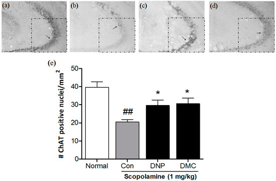Effects of DMC on the choline acetyltransferase (ChAT) expression in the CA3 region of the hippocampus. Representative photomicrographs show ChAT-positive nuclei in the CA3 of (a) Normal (distilled water); (b) scopolamine (1 mg/kg); (c) DNP (2 mg/kg); and (d) DMC (10 mg/kg). Arrows indicate examples of ChAT-positive neurons; (e) Columns show the means ± SEMs (n = 8) values of ChAT expression in the CA3 region of the hippocampus. ## p < 0.01 as compared to the vehicle-treated normal group; * p < 0.05 as compared to the scopolamine-treated control group.