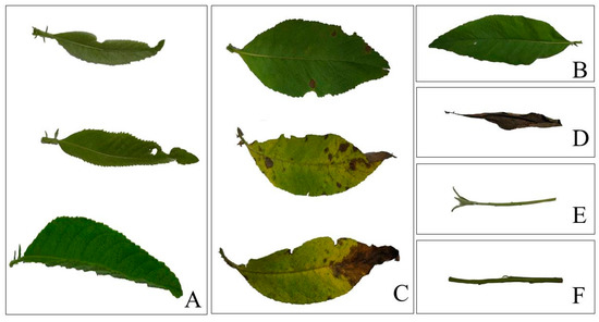 Different plant organs of B. balsamifera (A)-young leaves, (B)-mature leaves, (C)-senescent leaves, (D)-dead leaves, (E)-young shoots, (F)-young stems.