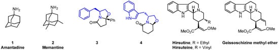 One area of research that we are particularly interested is in the development of small molecules that control exacerbated N-methyl-d-aspartate (NMDA) receptor activity. This area of research is incredibly challenging, as these ligand-gated ion channels exhibit a complex pharmacology and molecular architecture, which renders most antagonists unsuitable for therapeutic use [9]. Besides playing a crucial role in the biochemical cascade signaling behind the development of neurodegenerative disorders such as Alzheimer’s and Parkison’s diseases, NMDA receptors are also extremely important in sustaining healthy memory, learning and cognition processes [10]. Therefore, compounds that can suppress NMDA receptor activity during glutamate-induced excitotoxicity episodes, but leave its normal physiological role unharmed, are of great interest [11]. These constraints are quite difficult to overcome and to date only a handful of clinically tolerated molecules exist, such as amantadine (1) and memantine (2) (Figure 1) [12,13].