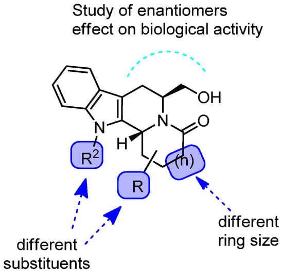 Following this work, we were interested in studying the indolo[2,3-a]quinolizidine scaffold obtained by cyclization of tryptophanol-derived oxazolopiperidones (Figure 2). This interest resulted from reports that several indolo[2,3-a]quinolizidine natural products protect neurons from NMDAR-mediated death. In fact, some alternatives for the treatment of mental dementia-associated symptoms come from long-used traditional medicines such as extracts from Uncaria plant species. These were found to contain biologically active compounds protecting neurons from NMDAR-mediated death [14]. In particular, the indolo[2,3-a]quinolizidines hirsutine and hirsuteine (Figure 1), present in choto-san and yokukansan extracts, reduce NMDAR-mediated Ca2+ neural overload [15,16]. Another indolo[2,3-a]quinolizidine present in these plant extracts is geissoschizine methyl ether, which besides presenting neuroprotective activity similar to that observed with hirsutine and hirsuteine is able to cross the blood-brain barrier by oral administration [17]. Although some of the fundamental pharmacological mechanisms through which these natural products exert their biological activity have been demonstrated [18], to the best of our knowledge, no studies have been performed with the indolo[2,3-a]quinolizidine nucleus reported herein. In this communication, we present the synthesis of a series of enantiopure indolo[2,3-a]quinolizidine derivatives, and their evaluation as NMDA receptor antagonists. In order to perform an initial structure-activity relationship (SAR) study, particularly directed to understand the structural features for optimal inhibition of NMDA receptor activity, we synthesized: (i) compounds containing different substituents at the piperidinone ring; (ii) pairs of enantiomers; (iii) compounds with different ring size of the lactam; (iv) compounds with the indole nitrogen free and protected (Figure 2).