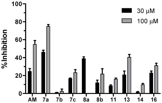 Inhibitory effect of compounds 7a–c, 8a–b, 11, 13, 14, 16 on N-Methyl d-Aspartate (NMDA)-induced intracellular calcium increase in cultured cerebellar granule neurons are shown at 30 μM (black) and 100 μM (dark grey) of each compound. Amantadine (AM) at 30 μM and 100 μM was included in the assay as a positive control. Compound 8a was not evaluated at 100 μM due to solubility issues.