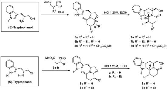 Reaction of (S)-tryptophanol with δ-oxoacid derivatives 9a–c afforded bicyclic lactams 5a, 5b and 5c, along with minor amounts of the respective diastereoisomers at the 8a position, 8,8a positions and 7,8a positions, respectively. The relative stereochemistry between H-3 and H-8a in the major lactams 5a, 5b, and 5c is cis (Scheme 2) [19,22,23]. Stereocontrolled cyclization of bicyclic lactam 5a with 1.25M HCl, led to the formation of indolo[2,3-a]quinolizidine 7a as a single diastereoisomer (Scheme 2) [19,20]. Cyclization of bicyclic lactam 5b by intramolecular α-amidoalkylation on the indole 2-position using HCl led to 6,12b-trans indoloquinolizidine 7b [22]. Not surprisingly, the cyclization of bicyclic lactam 5c in the presence of HCl-EtOH caused transesterification of the ester moiety and led to indoloquinolizidine 7c with very good yield (97%).