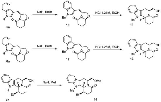 3.6. Synthesis of (1R,6S,12bR)-1-Ethyl-6-(methoxymethyl)-12-methyl-1,2,3,6,7,12b-hexahydroindolo [2,3-a]quinolizin-4(12H)-one (14)