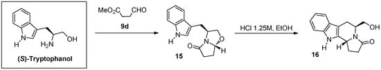 The asymmetric synthesis of indoloquinolizidines was achieved starting from enantiopure tryptophanol, a methodology used previously by the groups of Allin [19,20] and Amat-Bosch [21,22,23,24,25,26,27] for the synthesis of several indole alkaloids. In this synthetic strategy, tryptophanol is used not only as the source of chirality, but is also used to incorporate the tryptamine moiety present in the target alkaloids [28,29].