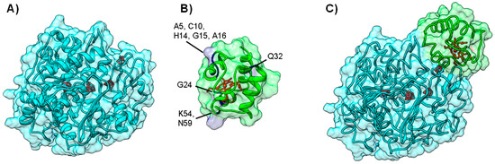 A summary of cases in which BiGGER was used in conjunction with experimental data can be found in Table S1 of the Supplementary Materials. One example was the modeling of Nitrous Oxide Reductase (N2OR). This enzyme catalyzes the last step of the denitrification pathway, the reduction of nitrous oxide to molecular dinitrogen, which provides an electron sink for some bacterial species to grow under anaerobic conditions [73,74]. N2OR has two multi-copper centers located in two different structural domains: a binuclear electron transfer center, CuA center, and a tetranuclear copper center, CuZ center, the catalytic site. The large distance between CuA and CuZ centers within the same monomer imposes a dimeric conformation on the enzyme, which is thus a functional homodimer, in which the two subunits are oriented “head to tail”, bringing CuA and CuZ centers to approximately 10 Å, an appropriate distance for an efficient electron transfer (Figure 5A).