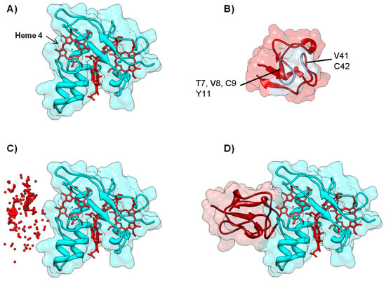 There are several reports in the literature in which the docking solutions are filtered using experimental information on both interacting surfaces. One such case is the interaction between cytochrome c3 and rubredoxin from D. gigas [94]. The former is a conserved tetrahemic c-type cytochrome present in the periplasm of sulfate reducing bacteria (Figure 7A), involved in the hydrogen metabolism and electron transfer processes to periplasmic and membrane-bound multi-heme cytochromes in metabolic pathways that ultimately generate ATP [95]. Rubredoxin is a small (5.7 kDa) metalloprotein containing a FeS4 center, present in the cytoplasm of different types of anaerobic and aerobic bacteria (Figure 7B); among several proposed interactions, D. gigas rubredoxin is thought to transfer electrons to enzymes involved in oxygen detoxification pathways: superoxide reductase and rubredoxin:oxygen oxidoreductase, in order to regenerate their catalytic metal centers after superoxide or oxygen reduction, respectively [96].