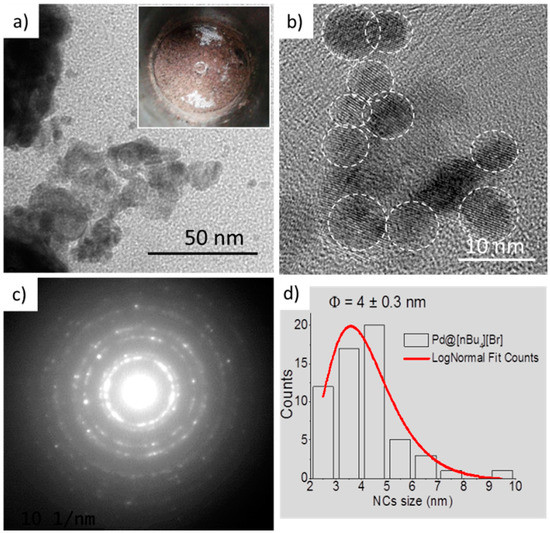 Very small and monodispersed NPs can also be obtained, as we have observed experimentally for other metals such as Ru, Ir, Pt [58]. The Pd NPs are however monocrystalline (Figure 1b,c) with a mean size of about 4 nm (Figure 1d). If this bulkier cation containing four symmetric alkyl chains is replaced by BnNMe3, less symmetrical and containing an aromatic ring, the Pd NPs size, morphology and chemical properties are affected. The obtained NPs are less aggregated, larger in size and less spherical (Figure 2a) leading eventually to different catalytic activity. It was assumed that the use of an OS with a long alkyl chain could stabilize the NPs more efficiently thus avoiding aggregation. With cetyltrimethylammonium bromide, slight improvement in monodispersity and an increase in size for Pd NPs were obtained (Figure 2b,c) with potential repercussions on NPs catalytic activity.