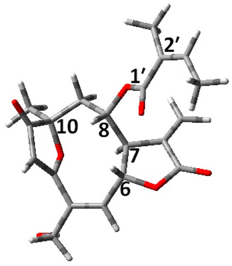 The relative AC of centratherin (see Figure 1) is known from the literature as (6R,7R,8S,10R,2’Z), and therefore this disatereomer was used for the theoretical calculations [26].
