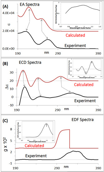 (A) Experimental and predicted electronic absorption spectra. Inset shows the similarity overlap plot as a function of wavelength scale factor; (B) experimental and predicted ECD spectra. Inset shows the similarity overlap plot as a function of wavelength scale factor; (C) experimental and predicted EDF spectra. Inset shows the similarity overlap plot as a function of wavelength scale factor. The experimental spectra are for (−)589-centratherin and predicted spectra are for (6R,7R,8S,10R,2’Z) structure. Data taken from Reference [26].
