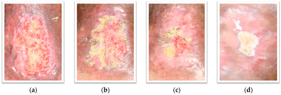 A 76-year-old woman presented with the chief complaint of a non-healing ulcer on the left leg, with pain and swelling. The ulcer had not responded to consistent conventional treatment for more than one year. The patient was a non-smoker and non-dinker. There was no history of trauma, varicose veins, or calf pain, but a history of vascular disease. Physical examination revealed a single shallow, irregular, large, almost rectangular shaped, about 6.8 × 4.3 cm ulcer on her lower left leg. The surface of the ulcer demonstrated shiny granulation tissue (Figure 2a). There were mild eczematous changes of the surrounding skin. There was a purulent foul smelling moderate amount of discharge from the wound, with surrounding edema. The patient reported pain at the affected area while walking and was referred to the angiology service for wound management. Despite rigorous medical measures in the form of frequent use of anabolic and topical antimicrobial agents (clostebol, neomycin, gentamicin and silver sulphadiazine), topical corticosteroids (betamethasone dipropionate), debridement, and dressing for the ulcer, the subject had a recurrent chronic wound on the left leg with an area measuring 23.52 cm2. The ulcer was in stage II, with not well defined wound margins. The angiologist prescribed a magistral formulation of a 2% (w/w) Punica granatum peel ethanolic extract (PGMF) based on a hydrophilic cream and zinc oxide. PGMF was applied to the ulcer once a day and the physician’s decision of application was taken with the written informed consent of the patient. Oral iron therapy, diuretics and other supplementary treatment were initiated. Tramadol was prescribed as pain reliever and no antibiotics were given during this course of treatment. After application, the ulcer was dressed with cotton gauge. Within six weeks, the ulcer had decreased to one quarter of its original size and had completely healed six weeks later (Figure 2b–d). A total of 90 applications were needed for complete healing. No adverse effects of PGMF were observed.