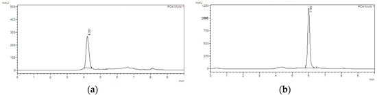 HPLC chromatographs of punicalin (a) and punicalagin (b) standards. Chromatograph was run on a Shimadzu LC-20AT HPLC equipped with a SPD-M20A PDA detection system. Separations were carried out on a Dr. Maisch GmbH C18 (Ammerbuch-Entringen, Germany) column (5 μm, 250 mm × 4.6 mm), 25 °C, with a mobile phase of 0.1% (v/v) aqueous solution of phosphoric acid and acetonitrile (80:20). The mobile phase flow rate was 1 mL/min with 10 min run time. The standards were detected using a wavelength of 254 nm. Sample injection volume was 10 μL. Retention times for punicalin and punicalagin were 4.203 and 5.987 min, respectively.