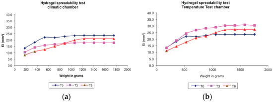 Spreadability test of hydrogel-based formulation of ethanolic extract of P. granatum peels (2% w/w) in different storage conditions. (a) Climatic chamber; (b) Temperature test chamber; T0: after production; T3: 3 months; T6: 6 months. Results are represented by means (n = 3).