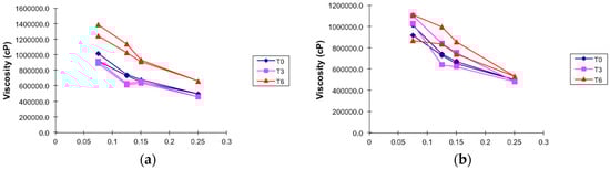 Viscosity—share rate curves of hydrogel-based formulation of ethanolic extract of P. granatum (2%, w/w); T0: after production, T3: 3 months and T6: 6 months of storage at different storage conditions. (a) Climatic chamber; (b) Temperature test chamber. Results are represented by means (n = 3).