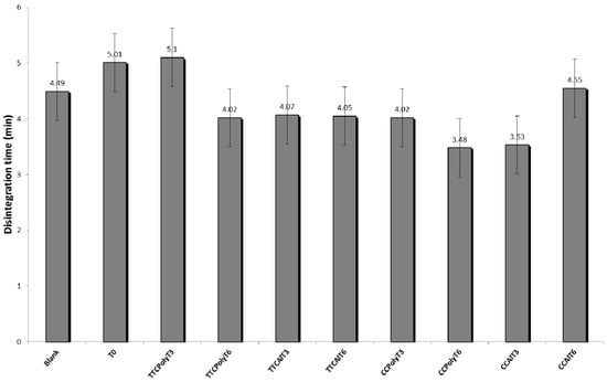 Disintegration time of hydrogel-base formulations. Blank; after production (T0); temperature test chamber-polyethylene-time: 3 months (TTCPolyT3); temperature test chamber-polyethylene-time: 6 months (TTCPolyT6); temperature test chamber-aluminum-time: 3 months (TTCAlT3); temperature test chamber-aluminum-time: 6 months (TTCAlT6); climatic chamber-polyethylene-time: 3 months (CCPolyT3); climatic chamber-polyethylene-time 3months (CCPolyT6); climatic chamber-aluminum-time: 3 months (CCAlT3); climatic chamber-aluminum-time: 6 months (CCAlT6). Results are represented by means ± S.E.M. (n = 3).