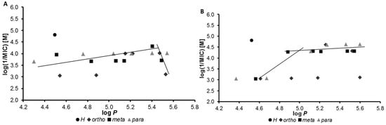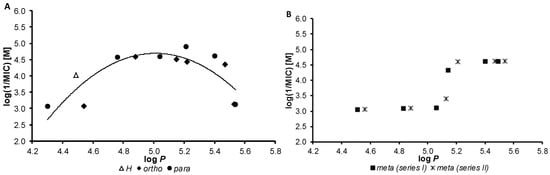 Relationships between in vitro antitubercular activity against M. tuberculosis log(1/MIC (mol/L)) and lipophilicity expressed as log P of unsubstituted, ortho- and para-substituted derivatives of series I (A) and meta-substituted derivatives of series I and II (B).