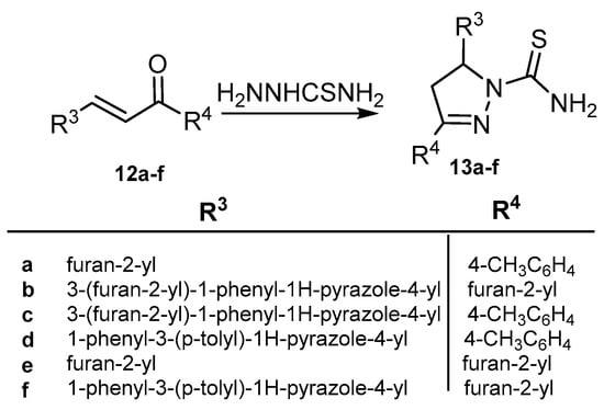 Treatment of 3-(furan-2-yl)-1-(p-tolyl)prop-2-en-1-one (12a), 1-(furan-2-yl)-3-(3-(furan-2-yl)-1-phenyl-1H-pyrazol-4-yl)prop-2-en-1-one (12b), 3-(3-(furan-2-yl)-1-phenyl-1H-pyrazol-4-yl)-1-(p-tolyl)prop-2-en-1-one (12c), 3-(1-phenyl-3-(p-tolyl)-1H-pyrazol-4-yl)-1-(p-tolyl)prop-2-en-1-one (12d), 1,3-di(furan-2-yl)prop-2-en-1-one (12e) and 1-(furan-2-yl)-3-(1-phenyl-3-(p-tolyl)-1H-pyrazol-4-yl)-prop-2-en-1-one (12f) with thiosemicarbazide in boiling ethanol containing potassium hydroxide gave 5-(furan-2-yl)-3-(p-tolyl)-4,5-dihydro-1H-pyrazole-1-carbothioamide (13a), 3’,5-di(furan-2-yl)-1’-phenyl-3,4-dihydro-1’H,2H-[3,4’-bipyrazole]-2-carbothioamide (13b), 3’-(furan-2-yl)-1’-phenyl-5-(p-tolyl)-3,4-dihydro-1’H,2H-[3,4’-bipyrazole]-2-carbothioamide (13c), 1’-phenyl-3’,5-di-p-tolyl-3,4-dihydro-1’H,2H-[3,4’-bipyrazole]-2-carbothioamide (13d), 3,5-di(furan-2-yl)-4,5-dihydro-1H-pyrazole-1-carbothioamide (13e) and 5-(furan-2-yl)-1’-phenyl-3’-(p-tolyl)-3,4-dihydro-1’H,2H-[3,4’-bipyrazole]-2-carbothioamide (13f), respectively (Scheme 2).