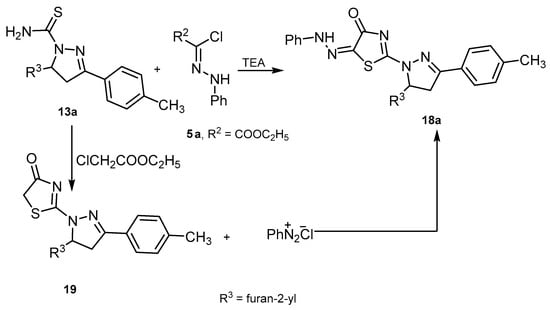 On the other hand, treatment of ethyl 2-chloro-2-(2-phenylhydrazono)acetate (5a) with 5-(furan-2-yl)-3-(p-tolyl)-4,5-dihydro-1H-pyrazole-1-carbothioamide (13a), in boiling ethanol containing triethylamine gave one isolable product according to TLC and proved to be 2-(5-(furan-2-yl)-3-(p-tolyl)-4,5-dihydro-1H-pyrazol-1-yl)-5-(2-phenylhydrazono)thiazol-4(5H)-one (18a). Also, benzenediazonium was reacted with 2-(5-(furan-2-yl)-3-(p-tolyl)-4,5-dihydro-1H-pyrazol-1-yl)thiazol-5(4H)-one (19), which was prepared via the reaction of ethyl chloroacetate with 13a, in ethanolic sodium acetate solution at 0–5 °C to afford a product identical in all aspects (mp, mixed mp and spectra) with 18a (Scheme 5)