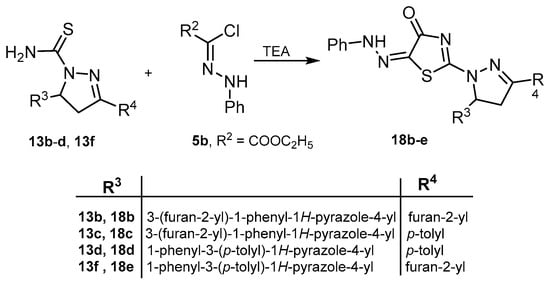 Similarly, carbothioamides 13b–d, and 13f were reacted with C-ethoxycarbonyl-N-phenylhydrazonyl chloride in ethanolic triethylamine to give the corresponding thiazolone derivatives 18b–e, respectively (Scheme 6).