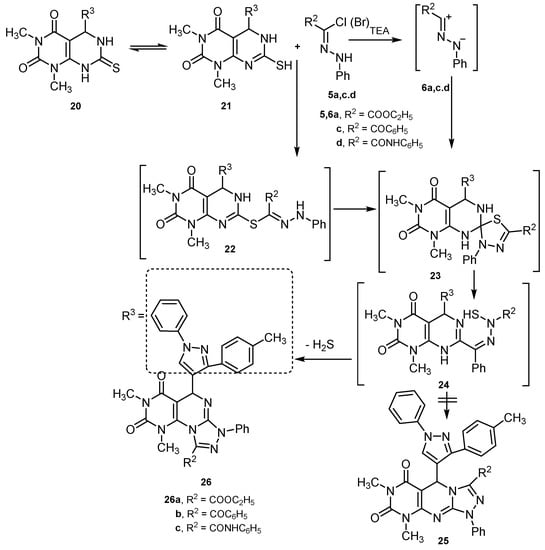 In further experiments treatment of 5a with 5,6,7,8-tetrahydro-1,3-dimethyl-5-(1-phenyl-3-p-tolyl-1H-pyrazol-4-yl)-7-thioxopyrimido[4,5-d]pyrimidine-2,4(1H,3H)-dione 20 in boiling chloroform containing triethylamine produced ethyl 2,4-dioxo-1,2,3,4,5,7-hexahydro-pyrimido[5,4-e]-[1,2,4]-triazolo[4,3-a]pyrimidine-9-carboxylate 26a in good yields (Scheme 7).