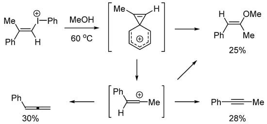 14], phenyl(phenylethynyl)iodonium trifluoroacetate (0.50 g, 1.2 mmol, 1 equiv.) dissolved in MeOH (5 mL) was added to a solution of 4-methylbenzene sulfinic acid (0.20 g, 1.3 mmol, 1.1 equiv.) in MeOH (2 mL) at 0 °C under a N