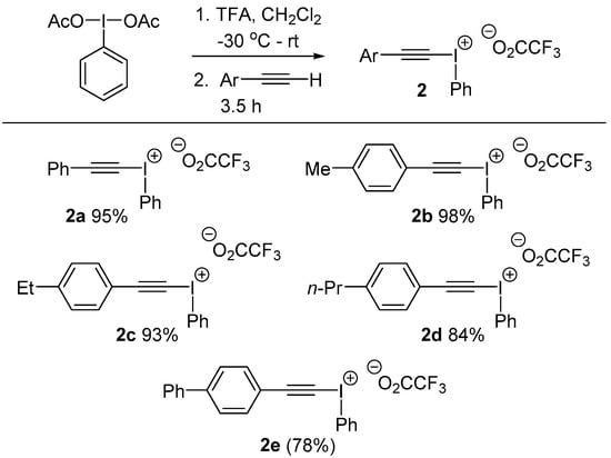 3.2. General Procedure for Alkynyl(phenyl)iodonium Trifluoroacetate 2 Formation: Preparation of ((4-Ethylphenyl)ethynyl)(phenyl)iodonium 2,2,2-trifluoroacetate 2c