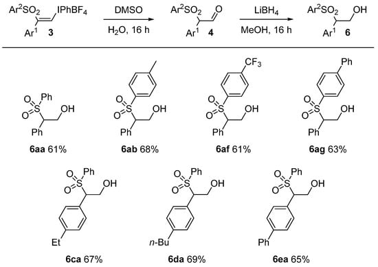 (Z)-Phenyl(2-phenyl-2-(phenylsulfonyl)vinyl)iodonium tetrafluoroborate, 3aa (50 mg, 0.094 mmol, 1 equiv.) was dissolved in DMSO (0.5 mL) at room temperature. Deionized water (20 μL) was added and the mixture was stirred overnight. Water (2.5 mL) was added to the mixture and the solution was shaken and then extracted with ethyl acetate (2 × 5 mL). The organic layer was dried with anhydrous magnesium sulfate, filtered and concentrated under vacuum. The crude product was dissolved in methanol (2 mL) and LiBH4 (2 mg, 0.094 mmol, 1 equiv.) was added in one portion. The mixture was stirred overnight and then extracted with diethyl ether (2 × 5 mL) and washed with water (5 mL). The residue was purified by flash chromatography (5:1 petrolem ether/EtOAc) which furnished 6aa as a colorless oil (0.015 g, 61%). IR: 3521 (w), 2428 (s), 1235 (m), 567 (w) cm−1. 1H-NMR: δ 2.77 (OH, dd, J = 8.7, 4.8 Hz), 4.16 (1H, ddd, J = 13, 8.7, 4.5 Hz), 4.38 (1H, dd, J = 7.9, 4.7 Hz), 4.66 (1H, ddd, J = 12, 7.9, 4.5 Hz), 7.06 (2H, d, J = 7.4 Hz), 7.22–7.30 (3H, m), 7.34 (1H, t, J = 7.4 Hz), 7.59–7.70 (4H, m). 13C-NMR: δ 61.5, 73.3, 126.1, 126.2, 129.2 (2C), 129.8 (2C), 129.9 (2C), 130.0 (2C), 130.6, 140.7. HRMS: m/z calcd. for [M + H]+ C14H15O3S+ 263.0736 found 263.0701.