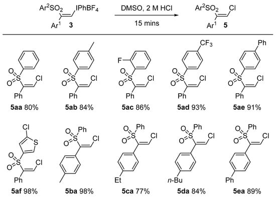 (Z)-Phenyl(2-phenyl-2-(phenylsulfonyl)vinyl)iodonium tetrafluoroborate 3aa (0.050 g, 0.094 mmol) was dissolved in DMSO (0.5 mL) at room temperature. HCl (2 N, 50 μL) was added and the mixture was stirred for 15 min. Brine (5 mL) was added to the mixture and the solution was shaken. This was extracted with ethyl acetate (2 × 10 mL) and washed with water (5 mL). The organic layer was dried with anhydrous magnesium sulfate, filtered and concentrated under vacuum. The residue was purified by flash chromatography (20:1 petrolem ether/EtOAc) which furnished 5aa as a colorless oil (0.026 g, 80%). IR: 1586 (w), 1444 (m), 1320 (m), 1147 (s), 628 (s) cm−1. 1H-NMR: δ 6.73 (1H, s), 7.26 (2H, d, J = 7.3 Hz), 7.34 (2H, t, J = 7.2 Hz), 7.41 (1H, t, J = 7.2 Hz), 7.49 (2H, t, J =7.8 Hz), 7.62 (1H, t, J = 7.4 Hz), 7.83 (2H, d, J = 7.6 Hz). 13C-NMR: δ 128.7 (2C), 128.8 (2C), 129.2, 129.4 (2C), 130.0, 130.5, 133.2 (2C), 134.2, 140.5, 145.6. HRMS: m/z calcd. for [M + H]+ C14H11ClO2S+ 279.0232 found 279.0241.