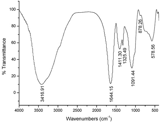 A strong polysaccharide absorption was observed at 190 nm. Moreover, no absorption appeared at 260 or 280 nm in the UV spectrum, indicating the absence of nucleic acid and protein (Figure 1). GPMPP did not contain phenolic compounds, as detected by the ferric chloride color method. The IR spectrum of GPMPP displayed a characteristic intense broad stretching peak at around 3417 cm−1 due to hydroxyl groups (Figure 2). Further, an asymmetrical stretching peak can be found at 1644 cm−1 and a weak symmetrical stretching peak near 1430–1390 cm−1, suggesting the presence of carboxyl groups [23]. The absorption at 1091 cm−1 is related to C-O stretching vibrations. The absorption at 878 cm−1 may be indicative index of α–glycosidic linkages in GPMPP. From Figure 3, GPMPP was determined by GC of the corresponding acetylated monosaccharides to be composed of rhamnose, arabinose, xylose, mannose, glucose and galactose in the molar ratio of 1.39:3.76:1.00:1.64:4.98:5.88. Mannose, glucose and galactose are three predominant monosaccharides in GPMPP accounting for 78.43% of the total monosaccharides. The molecular weight of GPMPP was about 36.7 KDal by dynamic light scattering, and further structural analysis was performed by NMR, MS and so on.