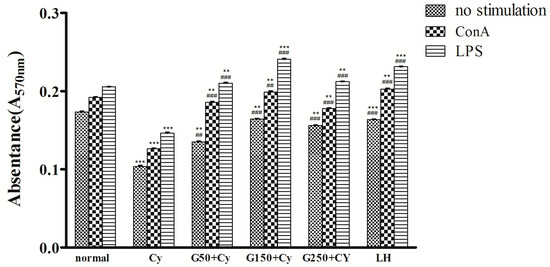 To further know the immunomodulatory activity of GPMPP, the effects of GPMPP on the proliferation of full splenic cells were investigated. One of the indicators of immunopotentiation is lymphocyte proliferation, which includes both T and B lymphocytes. It is known that ConA stimulates T cells, while LPS stimulates B cell proliferation [25]. In the current study, the splenocyte proliferation assays revealed that GPMPP had strong mitogenic potential to both T and B cells on the ConA-and LPS-activated splenocytes, respectively, indicating stimulatory effected on cell-mediated and humor-mediated immunity. ConA/LPS or non-stimulated splenocyte proliferation in the model group was significantly lower than that of the normal group. However, the treatment with GPMPP at the three tested doses resulted in a significant increase in ConA/LPS or no stimulation, and the intermediate dose of GPMPP treatment showed the best effects (Figure 4). T lymphocytes play a central role in cellular immunity, and B lymphocytes play a central role in humoral immunity. It had been reported that rice hull polysaccharides also stimulated the proliferation of T and B cells, but another report found that the polysaccharides from an herbal tea just enhance the proliferative ratio of ConA-induced lymphocytes [26,27]. It indicated that polysaccharides from Chinese herb and food have the potential ability to modulate lymphocyte proliferation, while the structure of polysaccharides played an important role in lymphocytes proliferation.