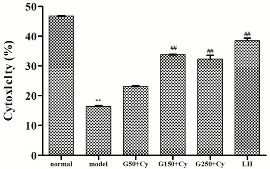 Effect of GPMPP on cytotoxicity of natural killer cells in Cy-treated mice. ** p < 0.01, compared with normal control. ## p < 0.01, compared with model control. Values are means ± SD, n = 10.