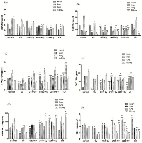 Effect of GPMPP on the (A) MDA level, and the activities of (B) SOD; (C) T-AOC; (D) CAT; (E) GSH-Px and (F) GSH in the heart, liver, lung and kidney of Cy-immunosuppressed mice. * p < 0.05, ** p < 0.01, *** p < 0.001, compared with normal control. # p < 0.05,## p < 0.01,### p < 0.001, compared with model control. Values are means ± SD, n = 10.
